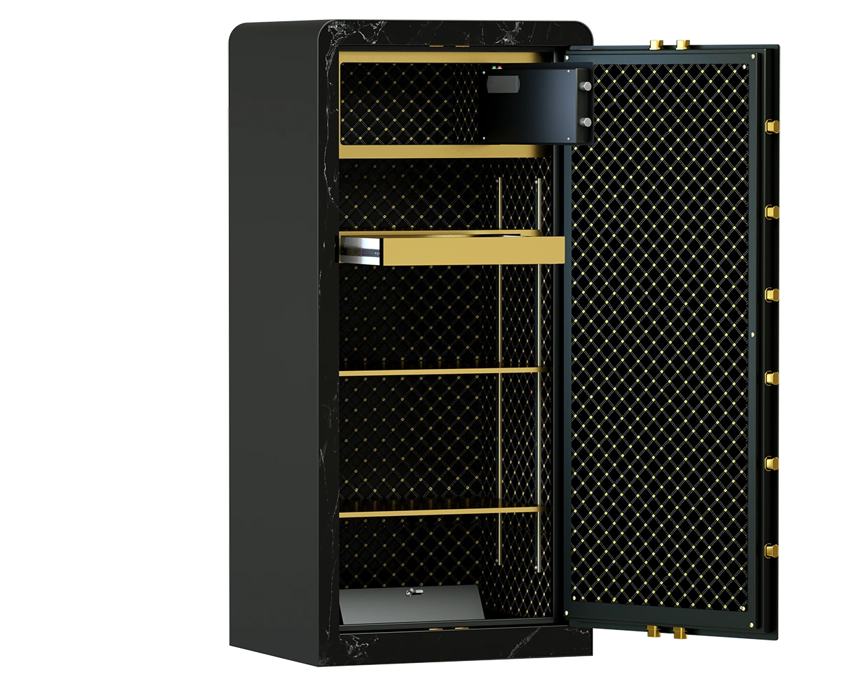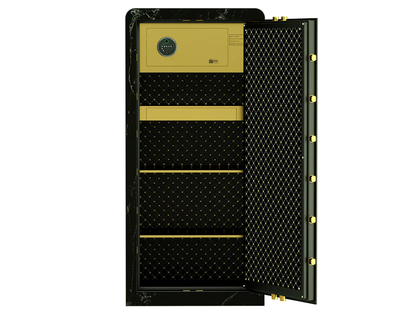 1. این گاوصندوق دیجیتال مدرن دارای جزییات مهندسی دقیق است. مثلا برای ایجاد نارسایی حرارتی، از طبقات mdf استفاده شده و این طبقات با فاصله اندکی از بدنه قرارگرفته‌اند که در انتقال گرما به داخل گاوصندوق را کاهش دهد.